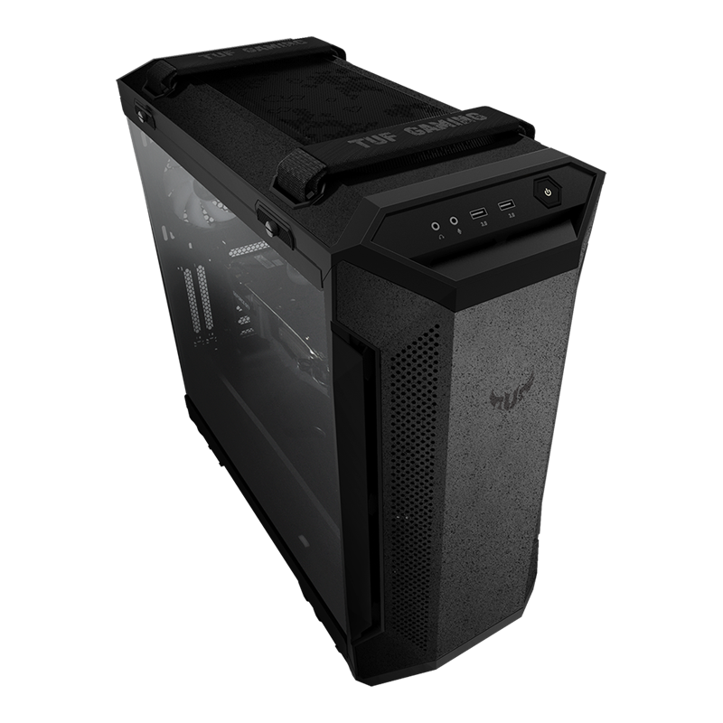 Diseñado para hacerse notar: Panel metálico frontal con un grabado TUF Gaming y un lateral de cristal templado que deja ver los componentes internos.